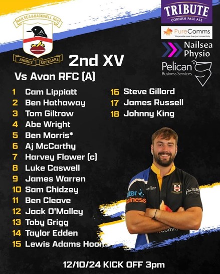 2nd Team selection to face Avon on Saturday 12 October, match is AWAY KO 3pm.