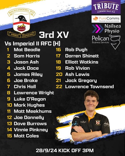 3rd XV team to face Imperial II at home. Kick off 3pm.
